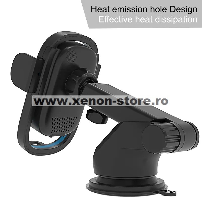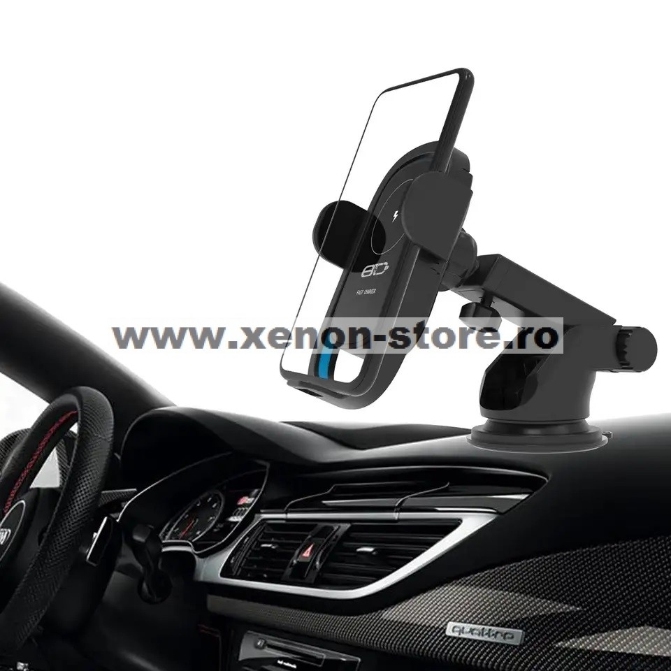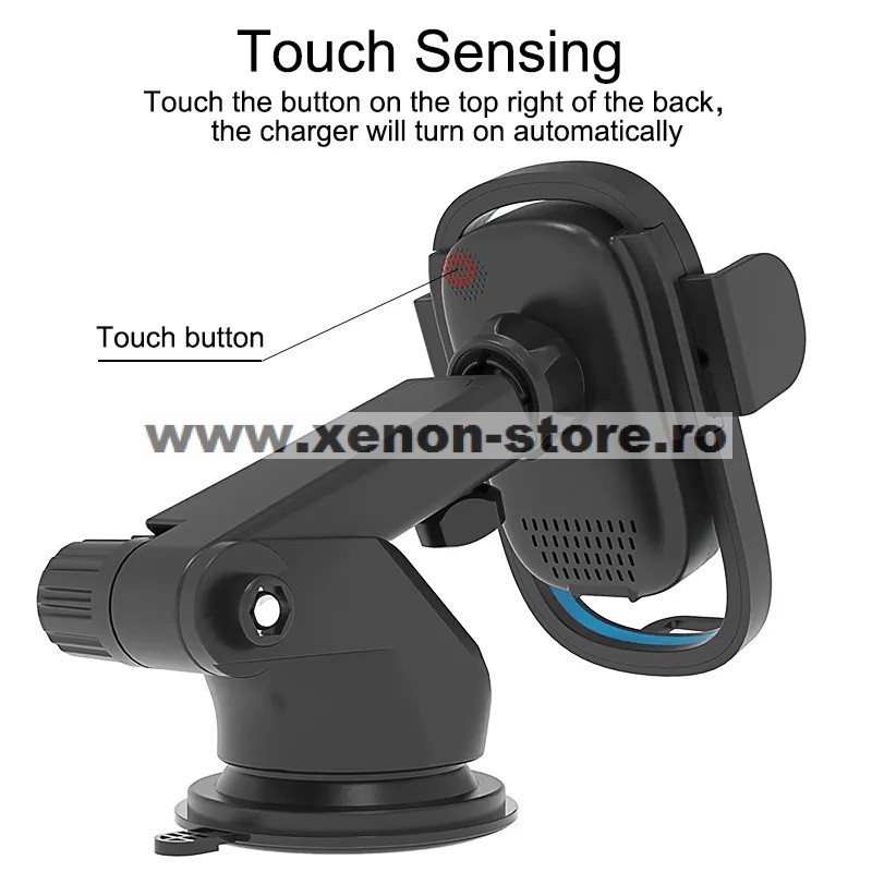 Sistem de fixare motorizat, cu senzor touch. Dupa ce se pune telefonul in suport bratele se inchid automat. Pentru deschiderea bratelor se atinge senzorul touch de pe spatele suportului.